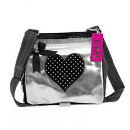 De canvas kindertas heeft een zwart hart met kleine sterretjes, een strikje op de voorkant en is te sluiten door middel van een drukknoop. De tas is afgewerkt met een rand glinsterende diamanten, bevat van binnen een vak voor je drinkbeker en een mobielhouder. Daarbij is de tas voorzien van een verstelbare schouderband.