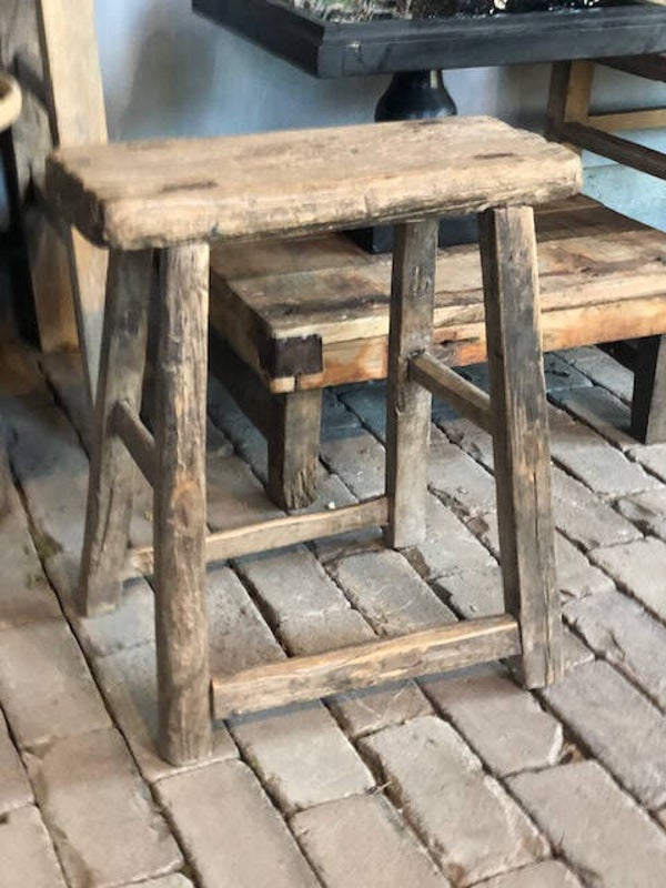 STOER sober oud houten zwaar robust melkkrukje, ieder krukje is uniek en daardoor verschillend, ook handig als klein bijzettafeltje.