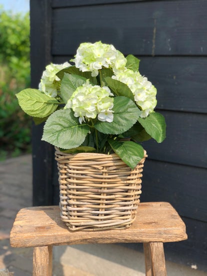 Prachtige Hortensia wit/groen kunstplant in binnenpot met 5 zijde bloemen mooi in evt. in rietenmand maar ook in een chinese oude kruik.